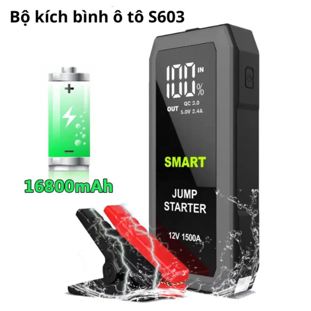 – Bộ kích nổ, kích bình 12v 1500A khẩn cấp S603 kiêm sạc dự phòng dung lượng pin 16800mAh, đèn Led trợ sáng cảnh báo.