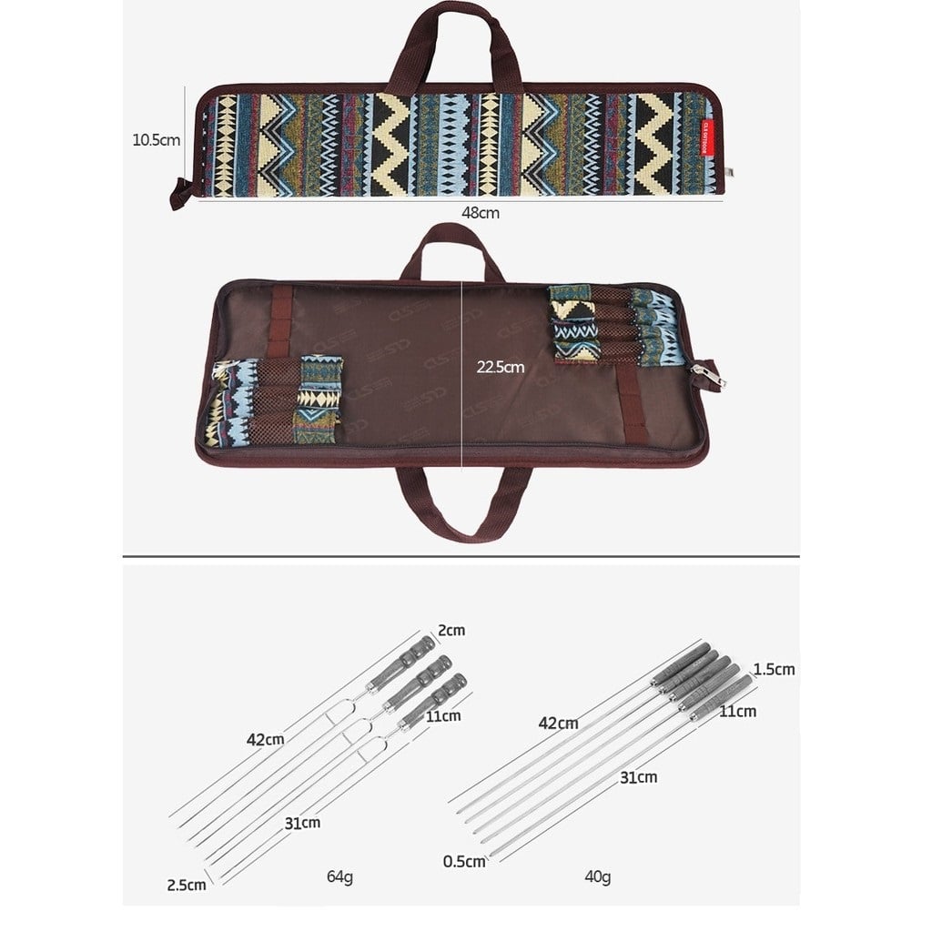 - Bộ sản phẩm bao gồm: 3 que xiên đôi + 4 que xiên đơn có thể sử dụng linh hoạt khi nấu nướng+ 1 chiếc túi đựng