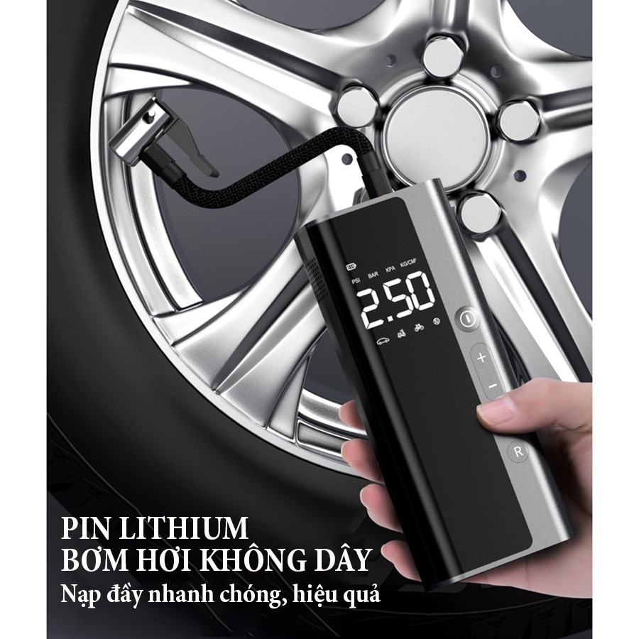 Máy bơm không khí 8000mAh với thiết kế điện tử cao cấp, giúp bơm lốp xe ô tô nhanh chóng và hiệu quả. Tích hợp sạc dự phòng thông minh và đèn chiếu sáng, sản phẩm mang lại sự tiện lợi và an toàn cho mọi chuyến đi.
