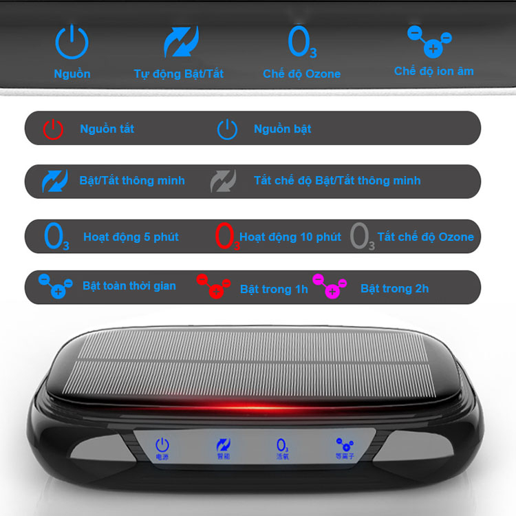 - Máy lọc không khí ô tô năng lượng mặt trời tạo Ozone và ion âm, diệt mùi khử khuẩn trên xe hơi để bảo vế sức khoẻ.