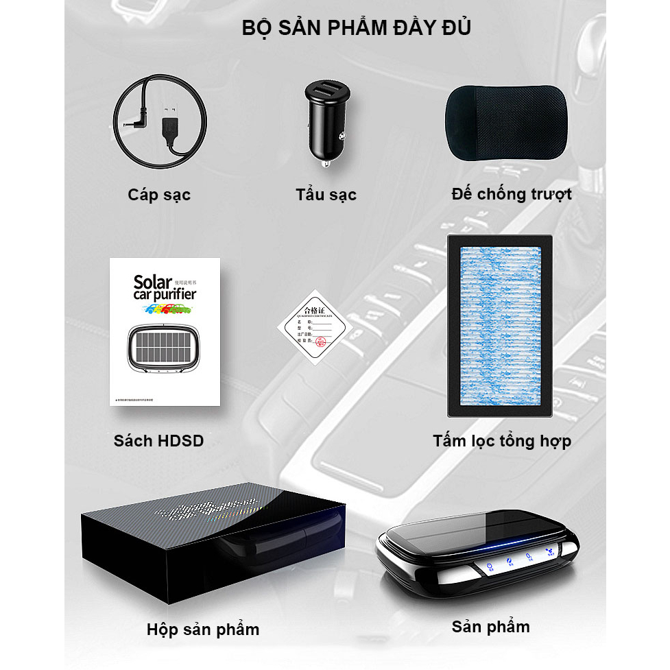 - Máy lọc không khí ô tô công nghệ Ozone, ion âm, sạc bằng năng lượng mặt trời.