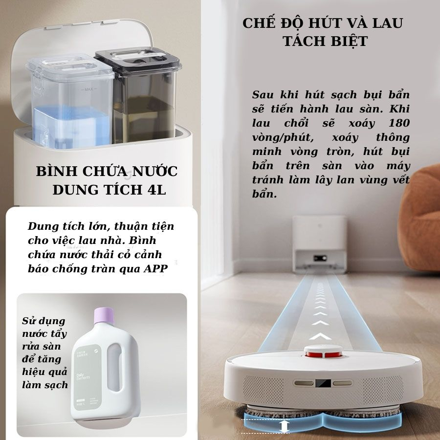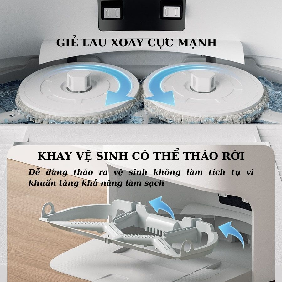 - Robot tích hợp chế độ tự động giặt giẻ lau sàn và sấy khô, không phải giặt bằng tay mà vẫn loại bỏ bụi bẩn