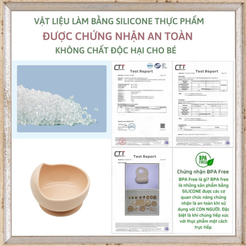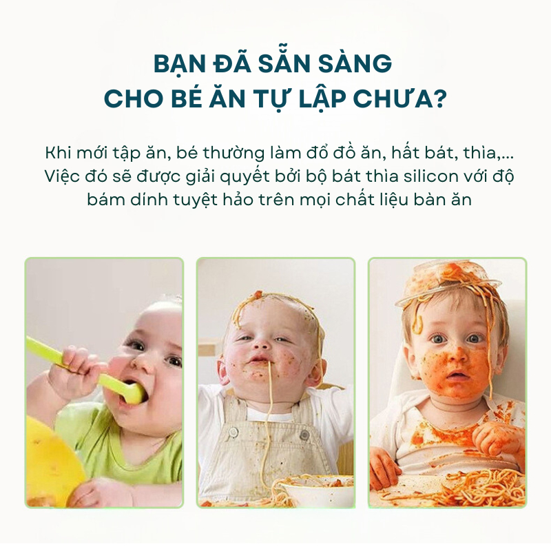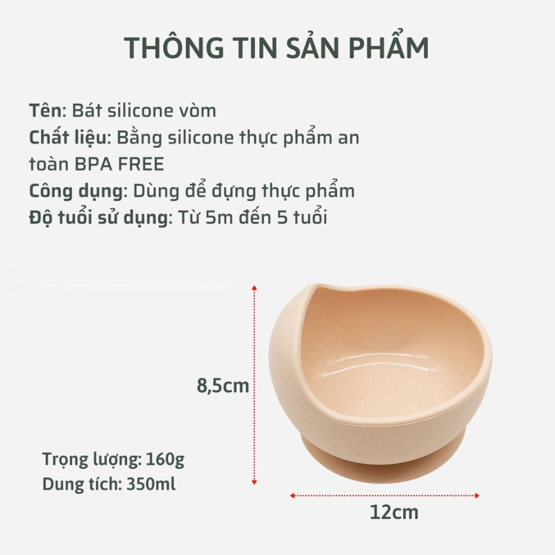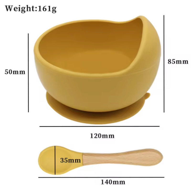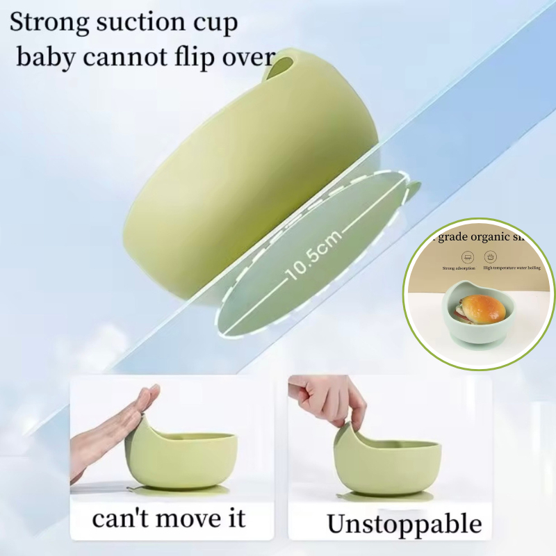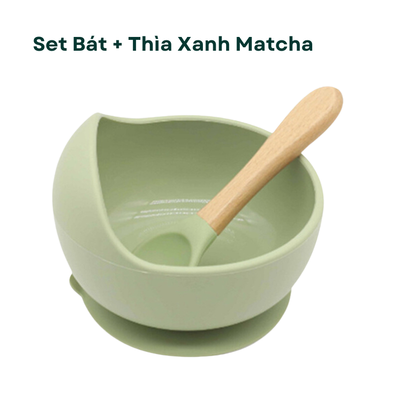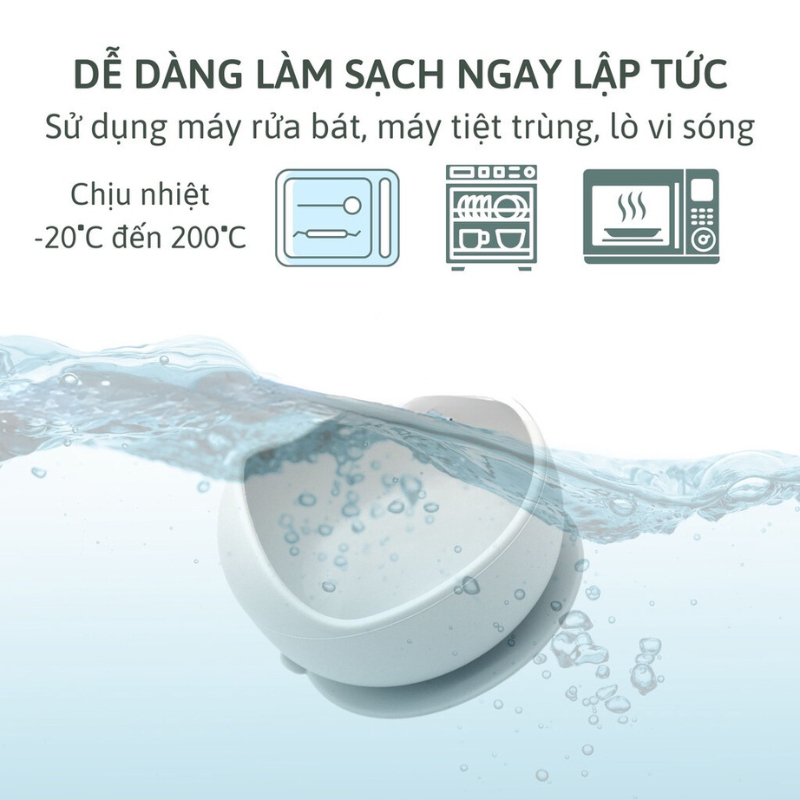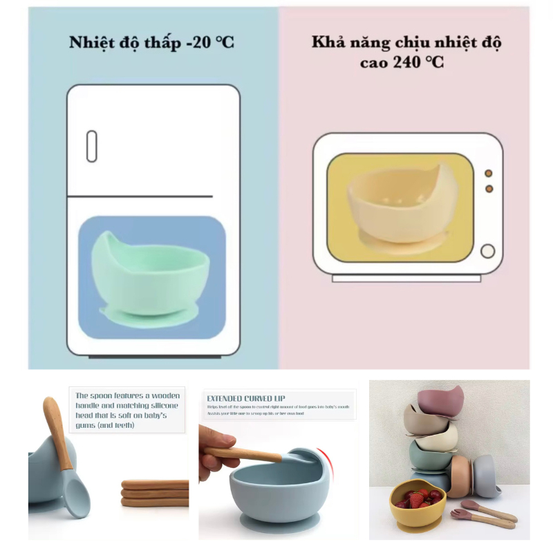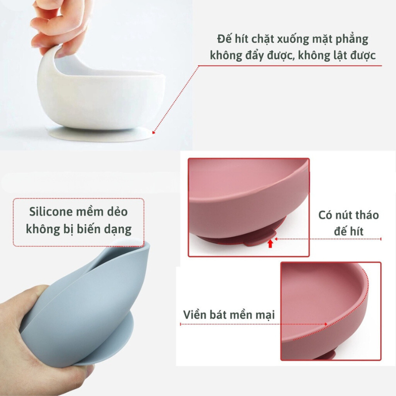 Bộ đồ ăn bát thìa bằng silicon an toàn, không mùi, đế bám dính chống trượt, chịu nhiệt cao dành cho trẻ em tập ăn dặm.